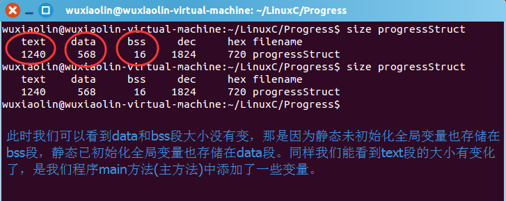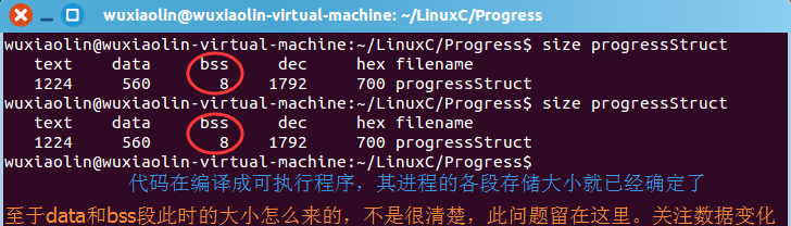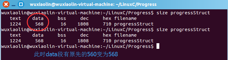 保存后,输入gcc progressSturnct.c -o progressStruct编译生成二进制文件(可执行文件),然后输入size