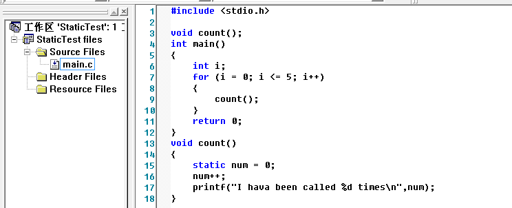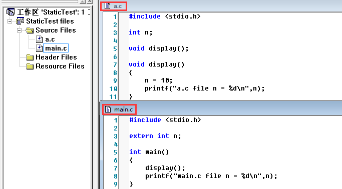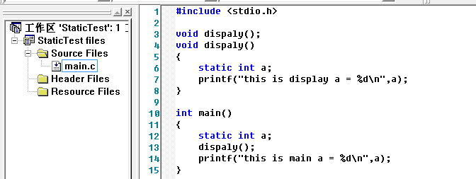先在VC6.0上创建一个工程,命名为StaticTest,并在这个工程中创建两个.c文件,分别为a.c和main.c,对应代码如下:
