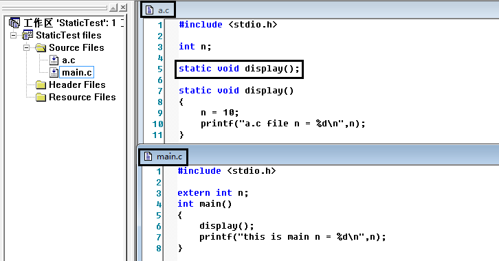 函数的定义和声明默认情况下是extern的,但是静态函数只是在声明它的文件中可见,不能被其他文件所用,例如: