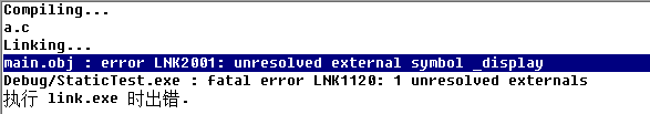 同样编译没有报错,而在链接时报错,错误提示找不到display()函数