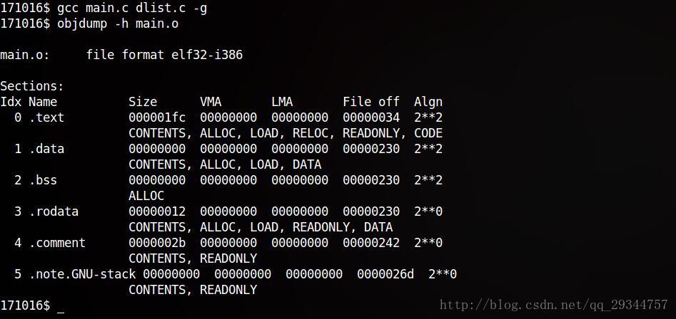 -h命令可以查看一个.o文件(已编译成二进制文件但未链接)的各个段: