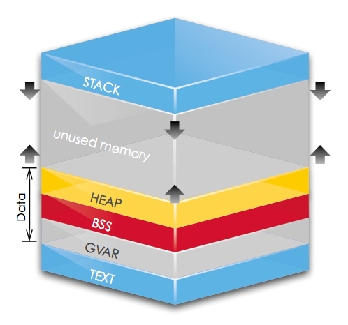 text、data(gvar)、bss 在内存中地址较低低的位置(low level address),而堆栈则在相对较搞的位置。