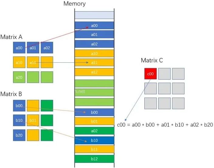 进一步,我们还需要了解矩阵的一维数据运算方式。矩阵的数据在内存中存储的格式是线性格式(行优先/列优先),如下所示,展示的是一种行优先的存储方式。可以通过索引计算来定位矩阵中的某个元素,比如第i行第j列的元素,在线性内存中的位置:i