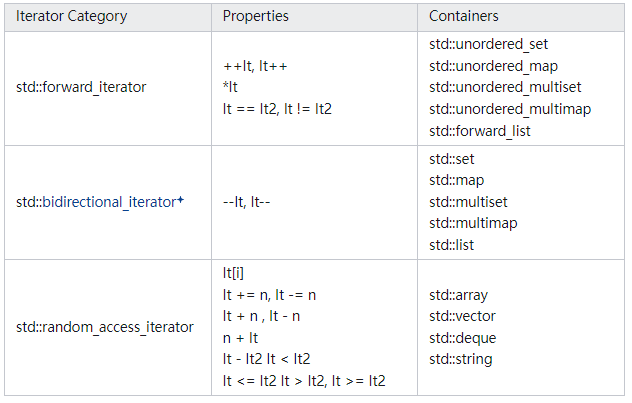 下面的关系成立:随机访问迭代器是双向迭代器,双向迭代器是前向迭代器。连续迭代器是随机访问迭代器,要求容器的元素连续存储在内存中。