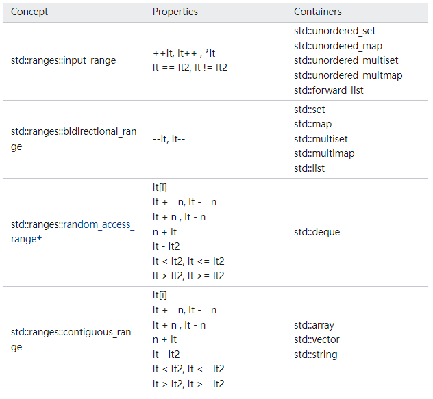 random_access_range:指定其范围。用索引运算符[] 取得任意元素的时间相同