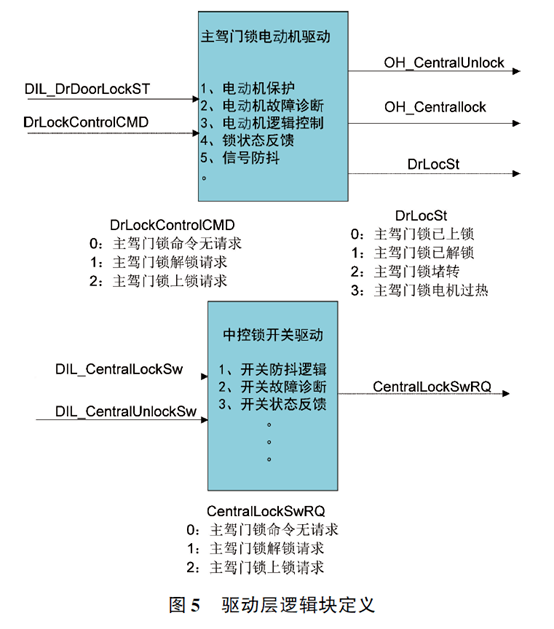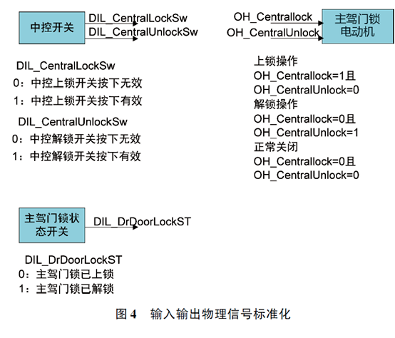 如图4所示, 以中控门锁的模块设计为例, 对输入输出信号标准化进行说明。