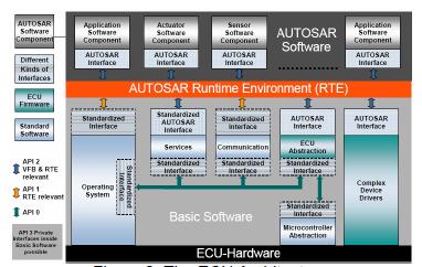 结构图在ECU-硬件之上,基本软件为AUTOSAR软件组件提供服务.在基本软件中,有四个不同的元素: