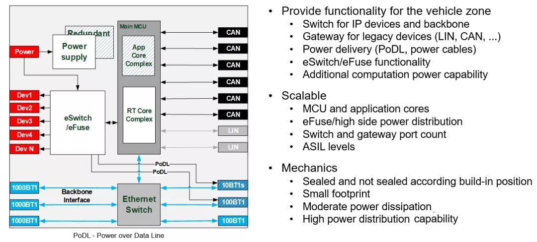 定位:ZCU主要充当网关、交换机和智能接线盒的角色;提供并分配数据和电力,并实现车辆特定区域的feature,如图12所示。