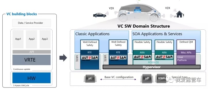 架构:VCC这种中央计算机的软件架构,可能会是基于Adaptive AUTOSAR的SOA(面向服务的架构);硬件架构,可能会是多颗大型SOC芯片,甚至会有专用SOC搭配(例如纯粹的AI加速核);芯片间通信,可能会是以太网或PCIe。