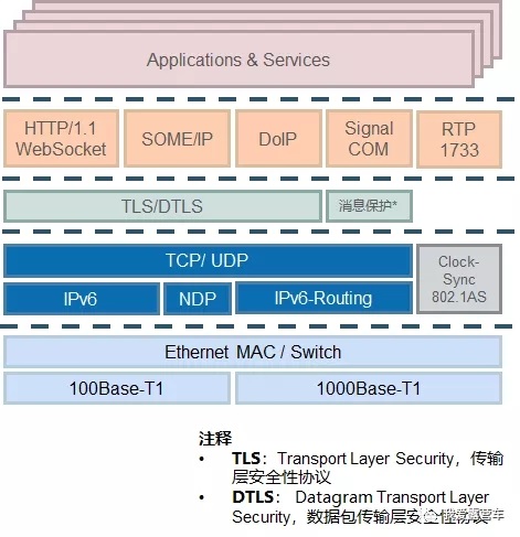 /Qch/Qci...,即车载时间敏感网络)、XCP(标定测量)等。另外,针对信息娱乐和网联服务,还需要实现HTTP。
