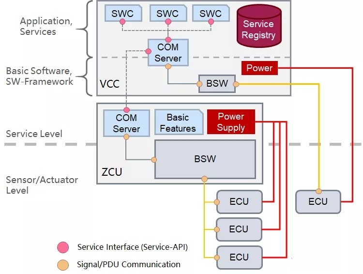 其中,主干网主要采用千兆车载以太网,用于连接VCC和ZCU,实现面向服务的通信(Service-Oriented