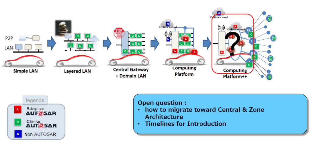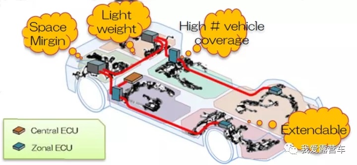 丰田的Zonal EEA:丰田的EEA属于典型的Zonal-EEA。首先,在硬件上,通过ECU的集成来降低控制器成本;软件上,使用基于Adaptive