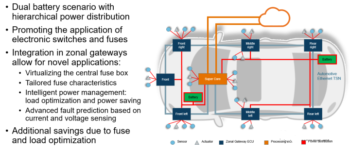 关于分级配电(供电):1.一级配电网络,双电源(冗余)将电力输送到区控制器;2.二级配电网络,区控制器负责将电力继续向下输送到底层控制器,因此区控制器需要具备eFuse/高边power