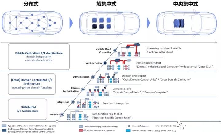 根据下图的描述,一般EEA从分布式到中央集中式需要经历三个阶段,即分布式-域集中-中央集中。