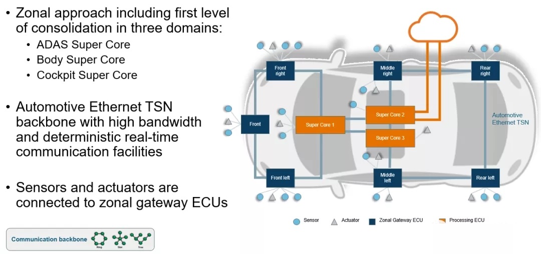 ECU)、环形链接的以太网TSN组成的主干网及CAN/LIN/10BaseT1s区内网、双电源冗余供电及区域内智能分级供电。