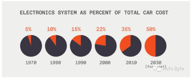 40% 的新车成本为基于半导体的电子系统,这一数字自 2007 年以来成本翻了一番。据估计,到 2030