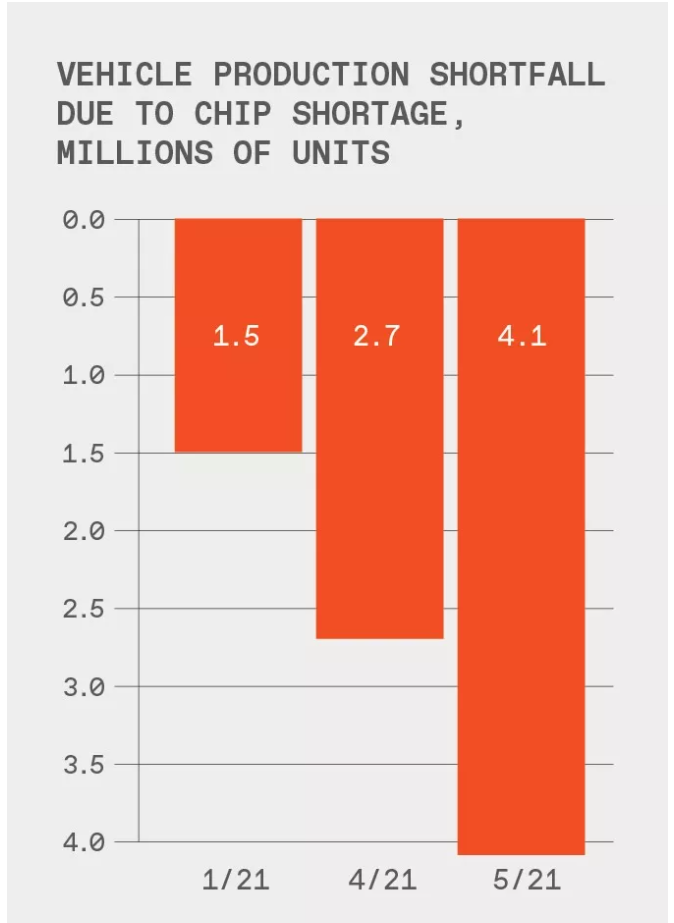 持续的半导体短缺令全球汽车行业损失还在持续上升。在一月,分析师预计,由于供应短缺,汽车产量将减少150万辆。到4月,这一数字稳步攀升至270万部以上,到5月,增至410万部以上。
