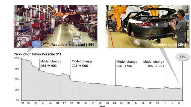 图3:1991 和 2013 年保时捷汽车组装比较,以及这段时期的生产时间的变化。来源:Porsche
