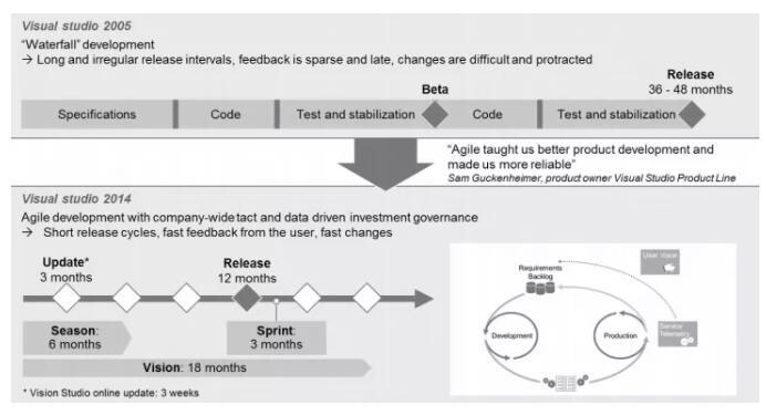 图8:比较软件开发工具 Visual Studio 在实现敏捷转型前后的周期。来源:Microsoft