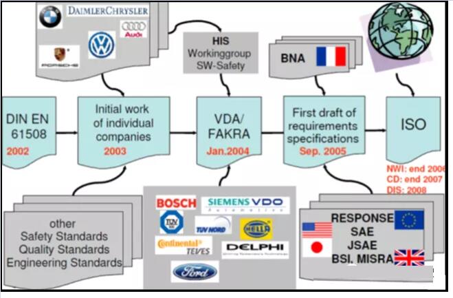 ISO 26262标准由众多国际一线整车及零部件企业共同起草,从2005年11月启动开始,经历了大约6年左右的时间,于2011年11月颁布首版正式实施。之后在2018年发布了第二版标准。