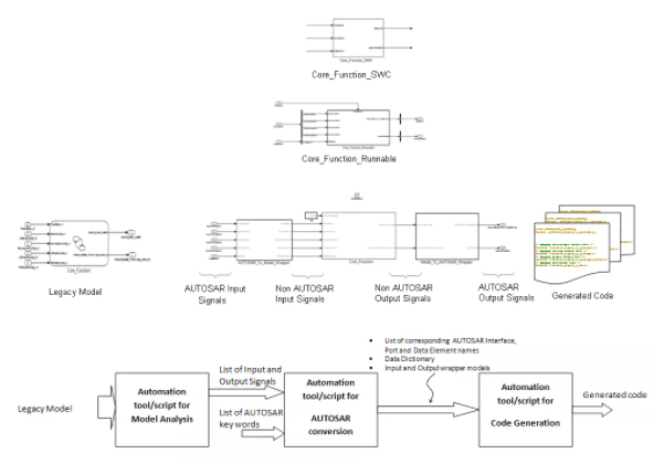 一个普通的传统车身控制应用程序分布在多个 Matlab/Simulink 模型上,这些模型在它们之间以及下层软件之间进行通信。进行向AUTOSAR开发迁移 的主要工作在于将这些 Simulink 模型转换为符合 AUTOSAR 标准的 SWC 。由于 Simulink 模型和接口的数量可能相当多,因此从开发工作和减少人为错误的角度来看,需要采用自动化方法创建 SWC。