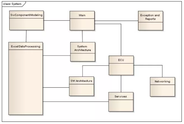 系统架构建模是使用 SystemDesk 完成的。SystemDesk 拥有 Python API,可实现架构建模和 RTE 生成过程的自动化。架构建模的 软件组件详细信息 直接从 Matlab 模型中提取,用户将在同一个 Excel 表中添加系统架构详细信息和 ECU 详细信息。python 脚本中的 ExcelDataProcessing 类将读取所有必要的信息并将其转换为定义的 标准格式 ,其他类将使用该信息来对架构进行建模并为 RTE 生成配置 ECU 详细信息 。Python 脚本的类图如图 5 所示。