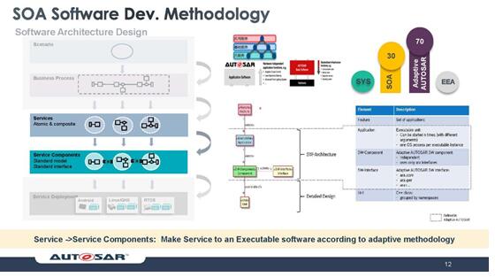 刚才我们说到了SOA好处,接下来看一下流程方法和工具。SOA是面向用户驱动型的场景,怎么样经过服务架构的设计,软件架构的设计,最后部署于各个预控制器甚至传感执行层的控制器,再进入到传统软件开发的过程。整体介绍还是会从场景开始到最后软件部署的阶段。