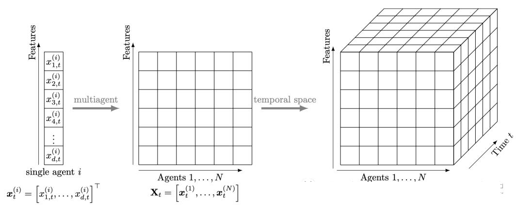 图神经网络(GNN)与常规深度学习(嵌入结构信息作为模型输入的多层神经网络)有一些共同点。信息池化是一种灵活的工具,可根据深度神经网络和大量编程开源的优势,将时域空间和空域空间的智体之间关系抽象为低维可量化嵌入(例如,归一化连续向量)。嵌入可以是时域相关的,捕获演化图(evolving