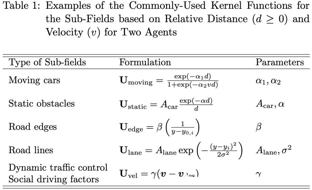 研究人员首先定性分析人类驾驶员在交互中的典型感知反应,然后设计具有相关约束的每个子场函数。如表1列出了每个子场公式的几种常用核函数,其中大多数是基于高斯的,因为可解释和可微分。