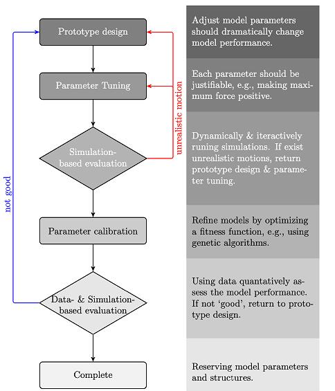 此外,社会力量允许将环境物理约束和交互行为的领域知识转化为个人的动态模型。虽然简单设计复杂的社会力模型听起来很合理,但它通常不会像预期的那样起作用。通用建模过程是一个循环和迭代过程,包括原型设计、参数调整、基于仿真的评估、参数标定以及基于数据和仿真的评估,如图所示。