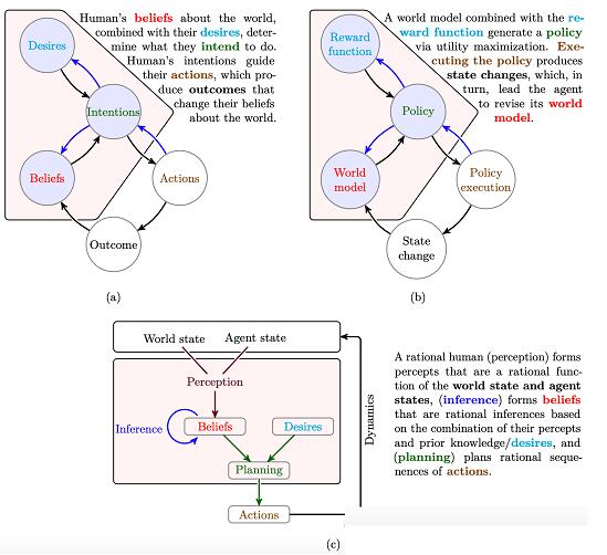 如图(a)和(b)比较了ToM和IRL/RL的结构,并表明可以在IRL/RL结构下指定ToM。蓝色箭头表示人类的心理状态推断(即在某些观察行为下,推断人类不可观察的信念和愿望),这与IRL中的问题相对应(即,根据一些观察策略执行,推断出智体的世界不可观察模型和奖励函数)。此外,ToM可以将人类心理形式化,即给定观察行为不可观察变量(即信念、欲望和感知)的贝叶斯推理,这是行为的生成模型。