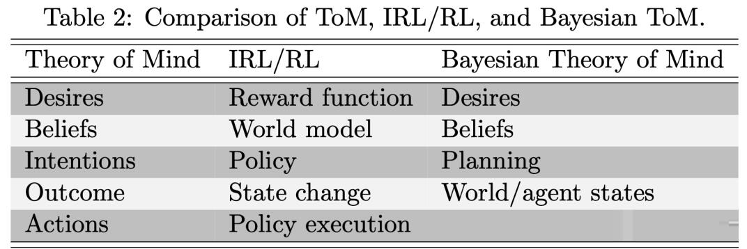 如表2还说明了ToM、IRL/RL和贝叶斯ToM的核心组件之间的联系。