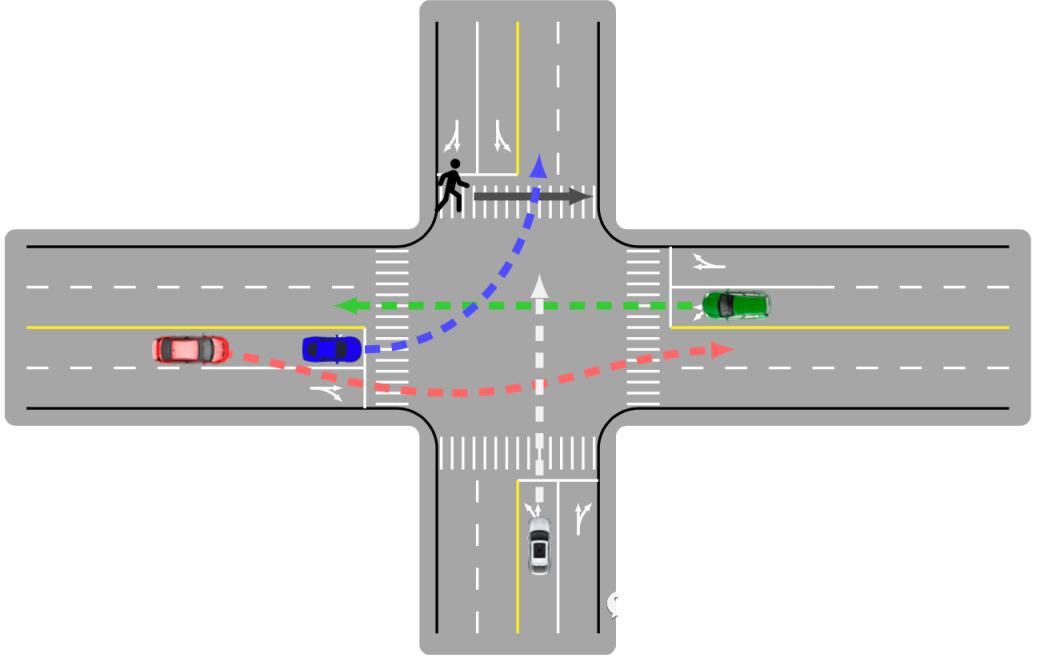 这里不讨论人类驾驶员与其他类道路使用者(即行人、骑自行车者和摩托车者)的交互;相反,只关心道路人类驾驶车辆之间的交互。