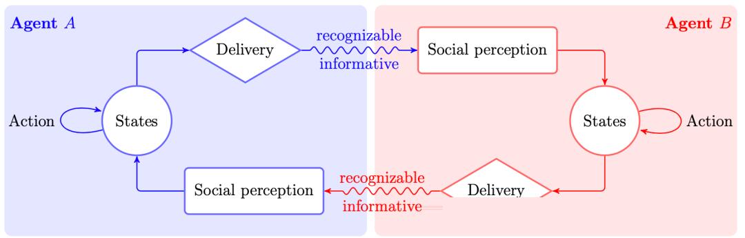 如图说明了两个智体(人类驾驶员和/或AV)之间的动态通信过程,每个智体在信息交换过程中扮演两个角色:信息发送者和接收者。例如,智体A将充当信息发送者,“告诉”智体B其意图。同时,智体B应该感知并理解智体A提供的信息(即感知),然后通过提供可识别的有用信息采取一些行动来响应或适应智体A。