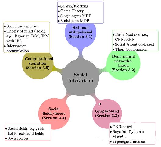 本文回顾了建模和学习人类驾驶员之间社会交互的各种方法,从优化理论和图模型(graphical models)到社会力理论和行为认知科学。还强调了一些新的方向、关键挑战以及未来研究的开放性问题。