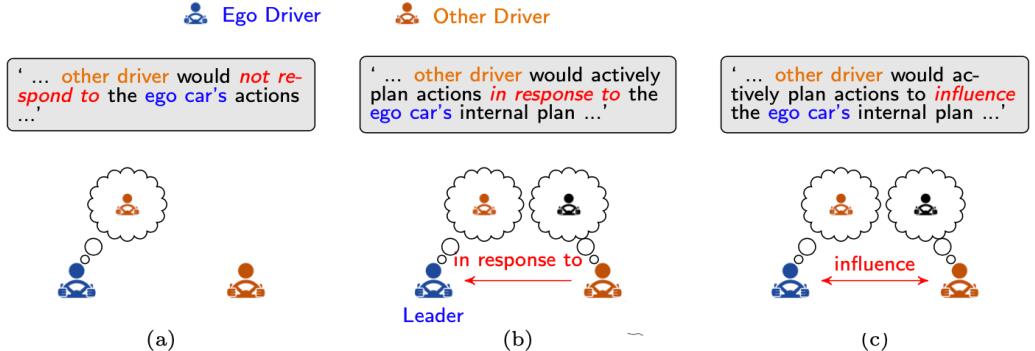 人类是天生的读心术;人类驾驶员天生就具有将自己置于其他驾驶员的位置并对其行为和意图进行推理的能力。与人工机器不同,心智理论(ToM)描述了人类与其他人类主体交互能力的一个基本属性,即人类可以对其他人类主体的心理状态和行为进行推理。