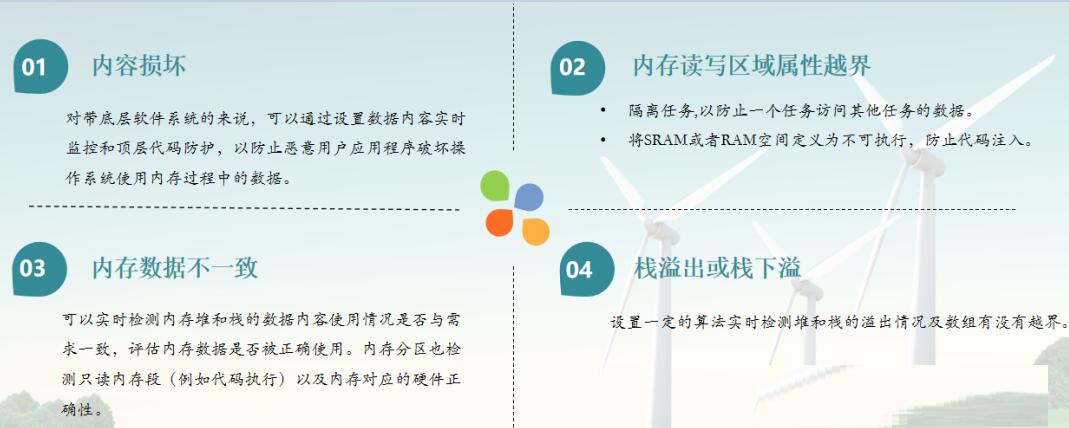由于每个可编程核心(总线主机)都有一个内存保护单元MPU(如果没有MPU,则可以通过DMA守卫来控制总线主设备的访问),它定义了软件访问保护措施,当MPU嵌入很多异构芯中时也同时具有内存保护功能,可以保护当前执行的代码不被一些“无关联”的数据所侵害,防止对内存数据的错误访问,并控制外围模块的寄存器。这类保护措施主要是限制相关内存地址权限,这类权限限制将确保其程序访问内存地址的范围与其无关,组织关键数据不被破坏,整个系统更加健壮、安全。