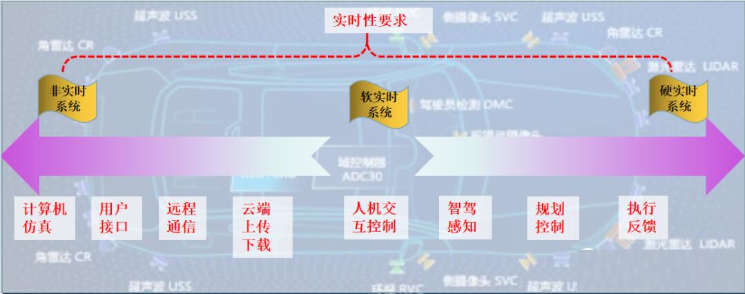 由于高阶自动驾驶系统一般都采用异构芯片进行不同数据信息源信息处理。需要严格限定硬件ECU在规定的时间内完成任务,否则就可能导致系统功能的失效。例如对于线控转向,如果驾驶员发出转向操作后100ms内车轮没有执行转向,则可能导致碰撞事故,严重的甚至造成车毁人亡。横纵向执行域的系统(ESP、EPS)往往属于这一领域。当然,如果硬件达标而软件执行期间出现一定的时间偏差,在设定的线性范围之内也是被允许的,例如有的应用要求系统在90%的情况下能够确保在规定时间内完成任务即可。车辆信息娱乐域(IVI)或动力域(VCU)的系统大多都属于这类系统。