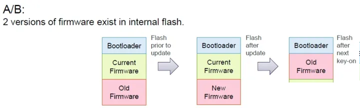 第2种,A/B交换方法与第1类的差别在于ECU硬件不支持地址重映射,激活新版本软件的入出地址变化。