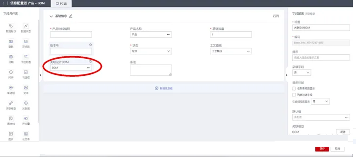 a.制造“BOM”信息模型,添加关联“设计BOM”的字段,建立设计BOM与制造BOM的数据关联关系: