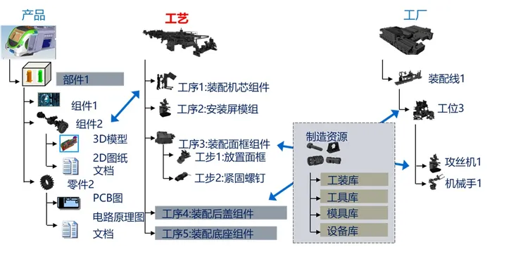 Architecture)数据模型,明确相互之间的关联关系,形成企业单一的BOM信息数据源,保证BOM数据的唯一性和准确性,可直观准确地回答这些问题:做什么(产品)、在哪做(工厂、生产线、工位)、怎么做(工艺规划),用什么做(设备、工装、工具)。