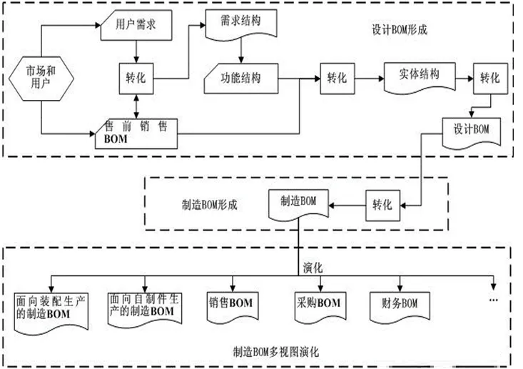 在制造过程中,不同类型的BOM信息视图的演进关系如下: