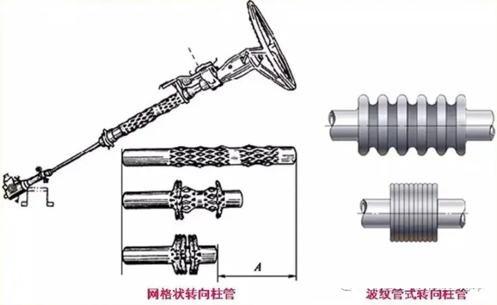 网格状或波纹管式转向柱吸能装置:当发生猛烈撞车导致人体冲撞转向盘时,网格部分或波纹管部分将被压缩产生塑性变形,吸收冲击能量。