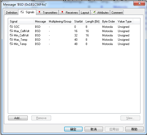 最高温度等5个信号;Signals就是指这5个信号。所以要解析这帧报文我们需要创建5个Signals,如下图二所示,创建对应字节长度的信号。