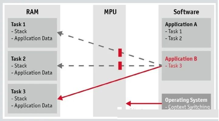 上文描述的内存区,堆栈区,数据区,代码区都可以被MPU保护,安全相关的微处理器通常都在硬件级别上支持内存分区保护,MPU主要是通过内存映射的地址范围限制,和监控非受信区域的内存访问来实现的。