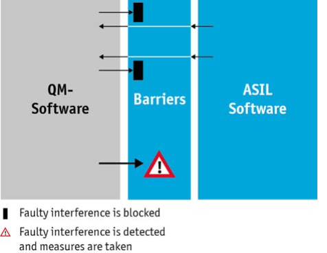 根据ISO26262,如果嵌入式软件包含不同ASIL等级的SWC,要么整个软件工程都需要基于最高安全等级的要求进行开发,需要保证拥有更高安全等级的SWC的操作不会受到其他SWC的干扰,也即需要做到FFI(Freedom