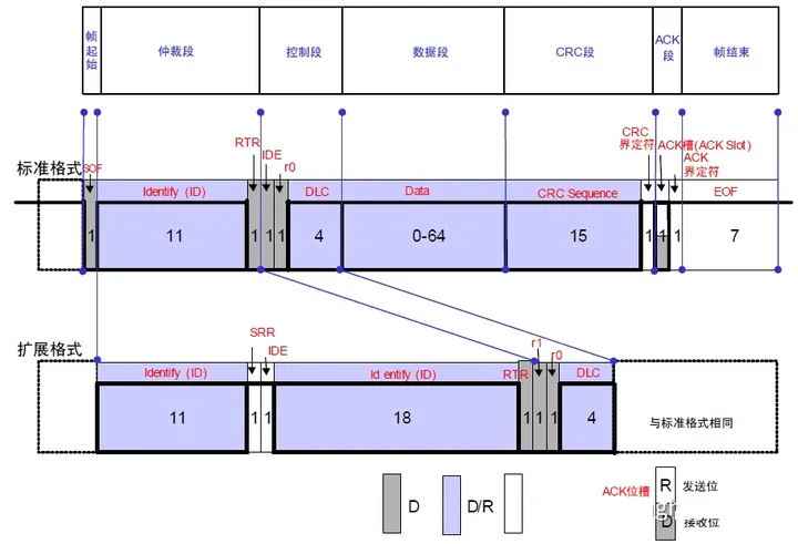 数据帧和遥控帧都有标准格式和扩展格式,这2种格式都具有相同的帧结构。