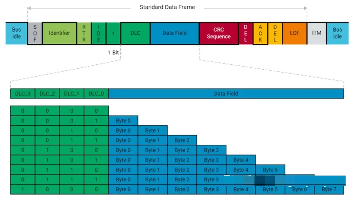数据段可包含0-8个字节的数据,从MSB(最高位)开始输出。遥控帧没有此段。