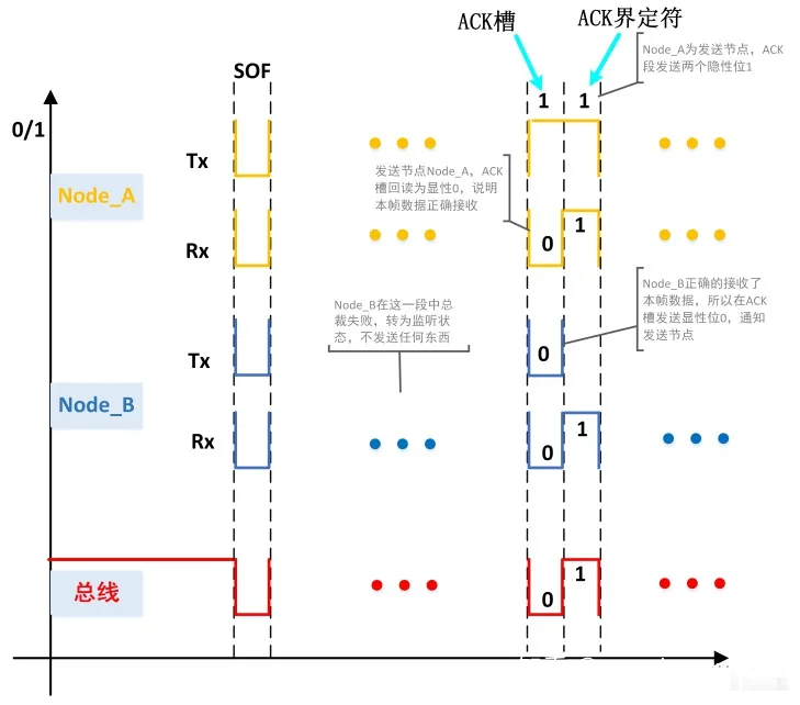 从D28-D18,采用线与机制,逐位进行比较,一旦某位出现不同,上图的ID25,则显性位覆盖隐性位,仲裁结束,显性位的对应节点胜出,上图的Node_A。