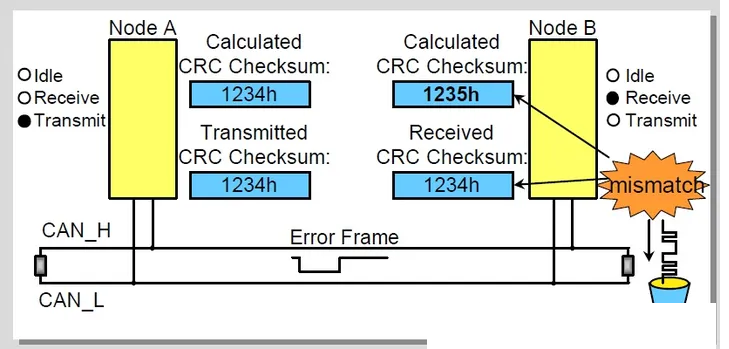 当作为发送方的节点会去接收自己发送的内容进行检查,即回读机制(节点在向总线上发送报文的过程中,同时也对总线上的二进制位进行“回读”,对比该节点发出的二进制位与总线上当前的二进制位是否一致,就可节点数据是否被正确接收。)